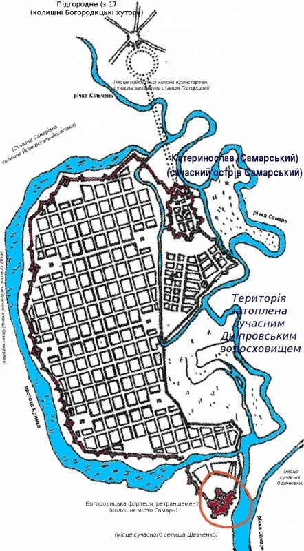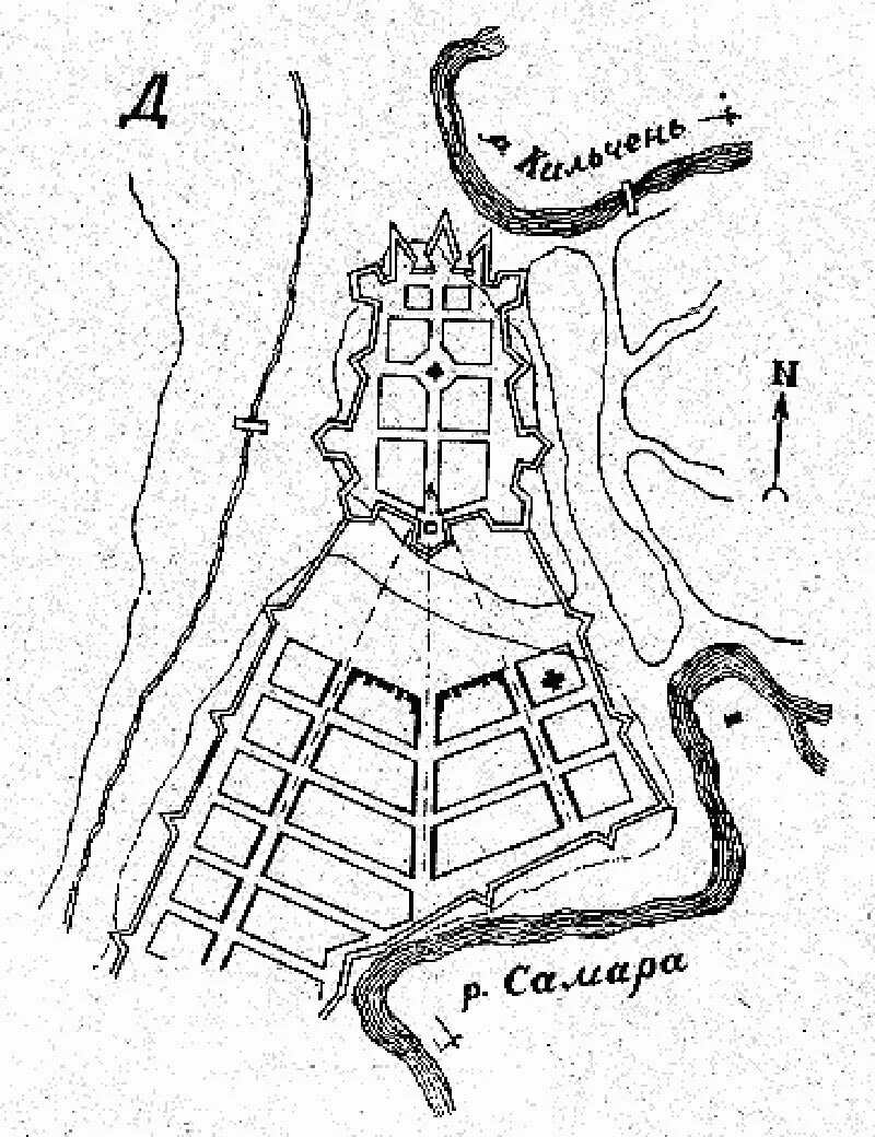 Итак, решил я найти старый план Екатеринослава с бастионными укреплениями. Искал план Екатеринослава, так как Днепропетровском он станет позже. Сделать это не получилось, так как первый Екатеринослав Кильченский, или его еще называли Екатеринослав Самарский, якобы отдали на растерзание крестьянам, потому что город был построен в неудачном месте - между реками Кильчень и Самара в месте их слияния, поэтому его постоянно затапливало водой. А потом построили второй Екатеринослав, на правом берегу Днепра. Цитирую эту байку, взятую отсюда.