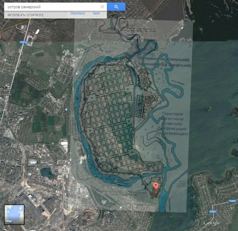Видим, что он огромен. Забегая вперед, скажу что он 4.7 километра от верхей границы до нижней. Это примерно как Васильевский остров в Петербурге. Естественно, город был 100% античным и красивым, потому что его называли третьей столицей. Внизу плана , красным кружком я обвел Богородицкую крепость. Как видим она находится в составе Екатеринослава Кильченского. Теперь мы можем наложить этот план на спутниковый снимок этой местности. Нам нужно совместить Богородицкую крепость.