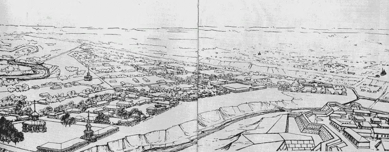 Эта цитадель изображена на этом рисунке. Здесь видно лишь ее кусочек, а слева от нее художник нарисовал северные пригороды Екатеринослава, которые находятся за бастионной стеной: