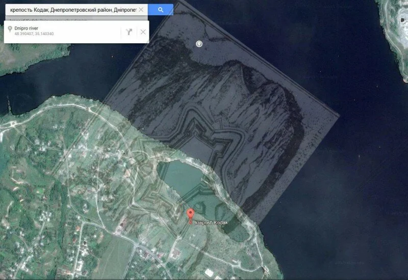 Накладываем старый план крепости Кодак на нынешний спутниковый скриншот